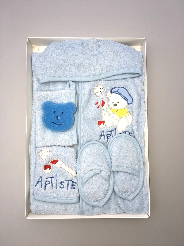 В набор входят:Халат, тапочки, слюнявчик, губка и мочалка